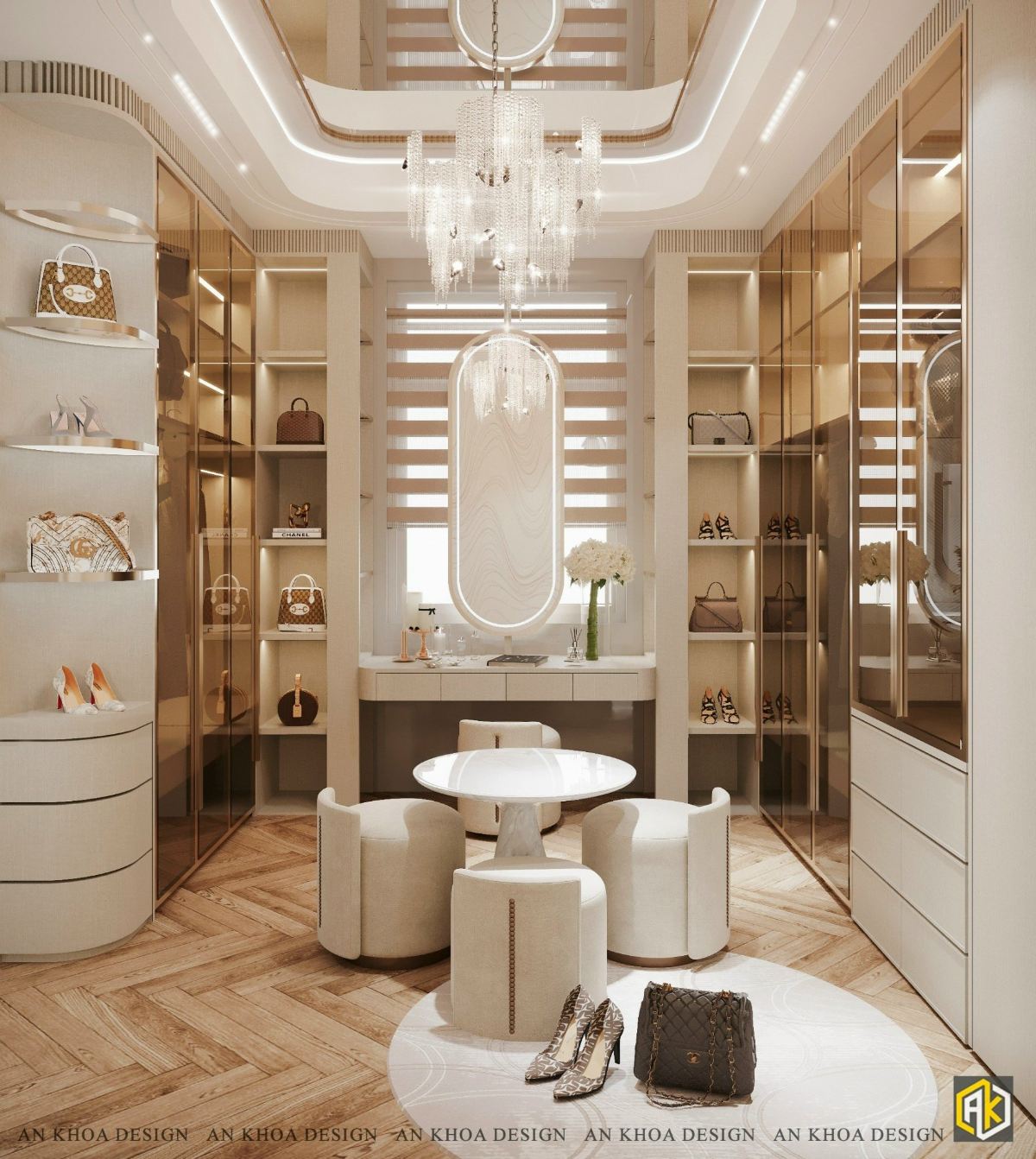 Không gian lộng lẫy với hệ tủ kính sọc dọc hiện đại, tôn vinh bộ sưu tập thời trang, điểm xuyết bàn trang điểm thanh lịch như một góc riêng đầy mê hoặc