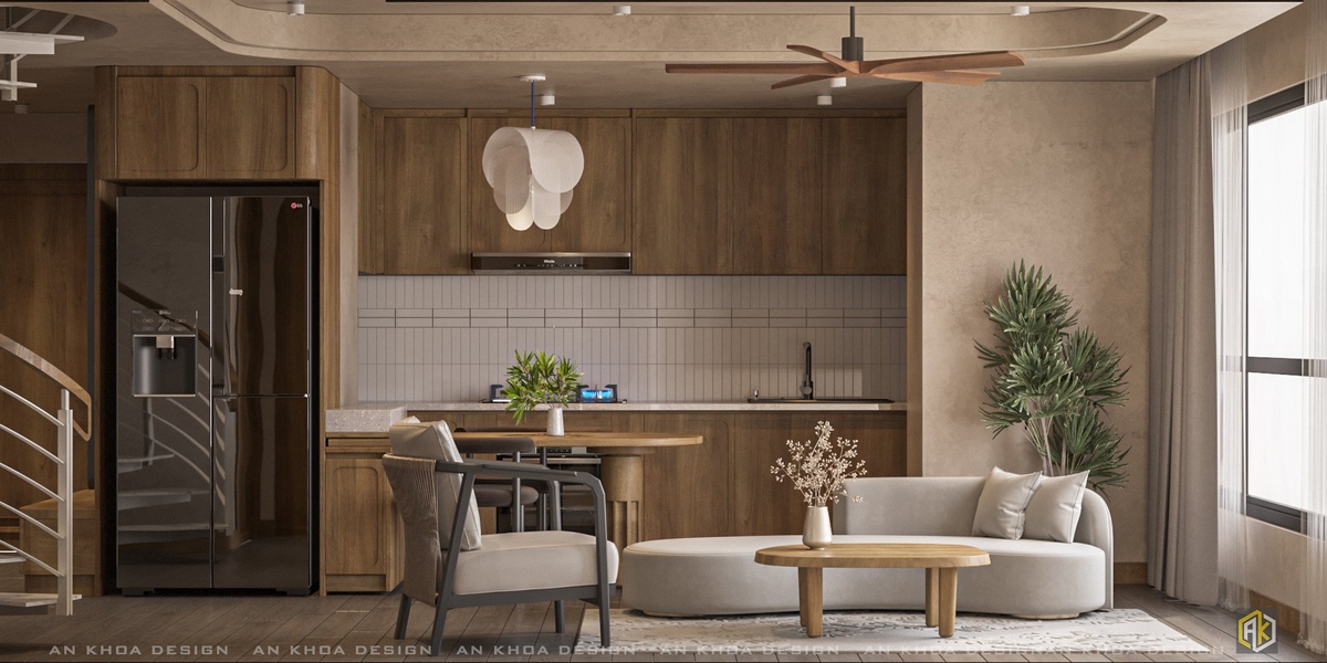 Gian bếp ấm cúng với nội thất gỗ và phòng khách thư thái với sofa cong mềm mại, dưới ánh đèn thả hình chiếc lá độc đáo, tạo nên một không gian sống liền mạch và đầy cảm hứng
