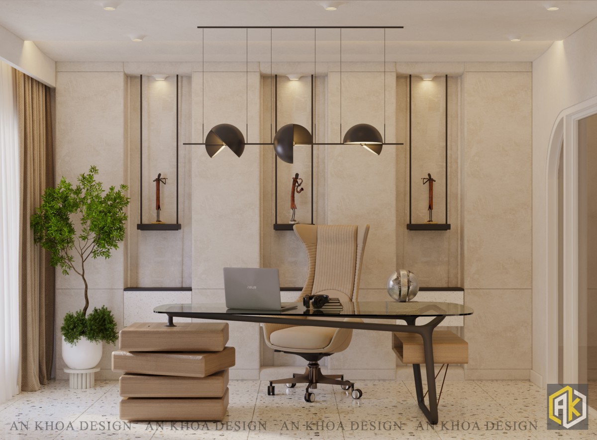 Góc làm việc tinh tế và đầy cảm hứng, với chiếc bàn kính thanh lịch, chiếc đèn thả độc đáo và những kệ trang trí ẩn, tạo nên một không gian sáng tạo và sang trọng