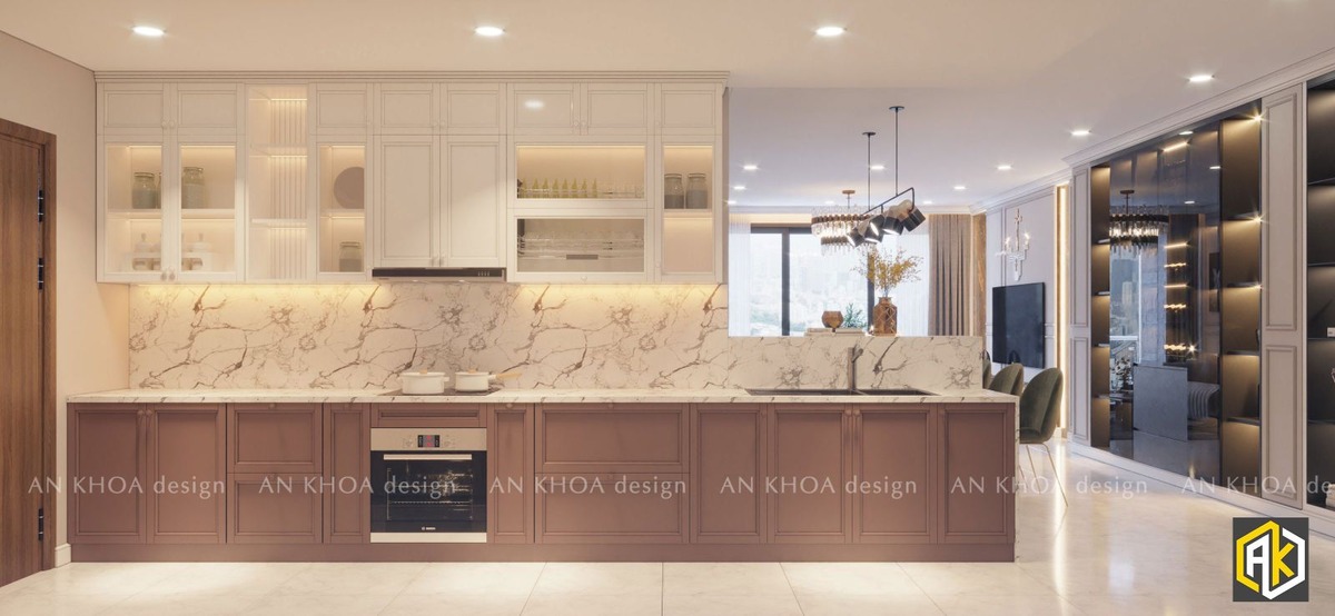 Không gian bếp tinh tế với tường ốp vân đá sang trọng, tủ bếp màu đất nhạt thanh lịch và ánh sáng dịu nhẹ, tạo nên tổng thể ấm áp, liền mạch hoàn hảo với phòng khách bên cạnh