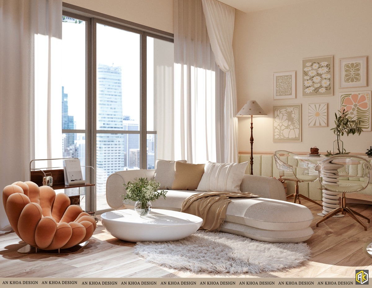 Không gian phòng khách tràn ngập ánh sáng tự nhiên, nơi chiếc ghế bành vỏ sò màu cam nổi bật như một đóa hoa giữa bộ sofa góc mềm mại và những vách tường cong duyên dáng