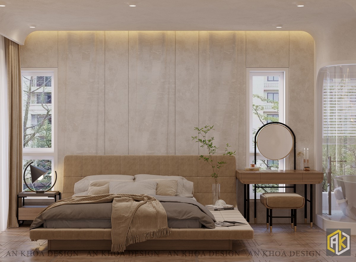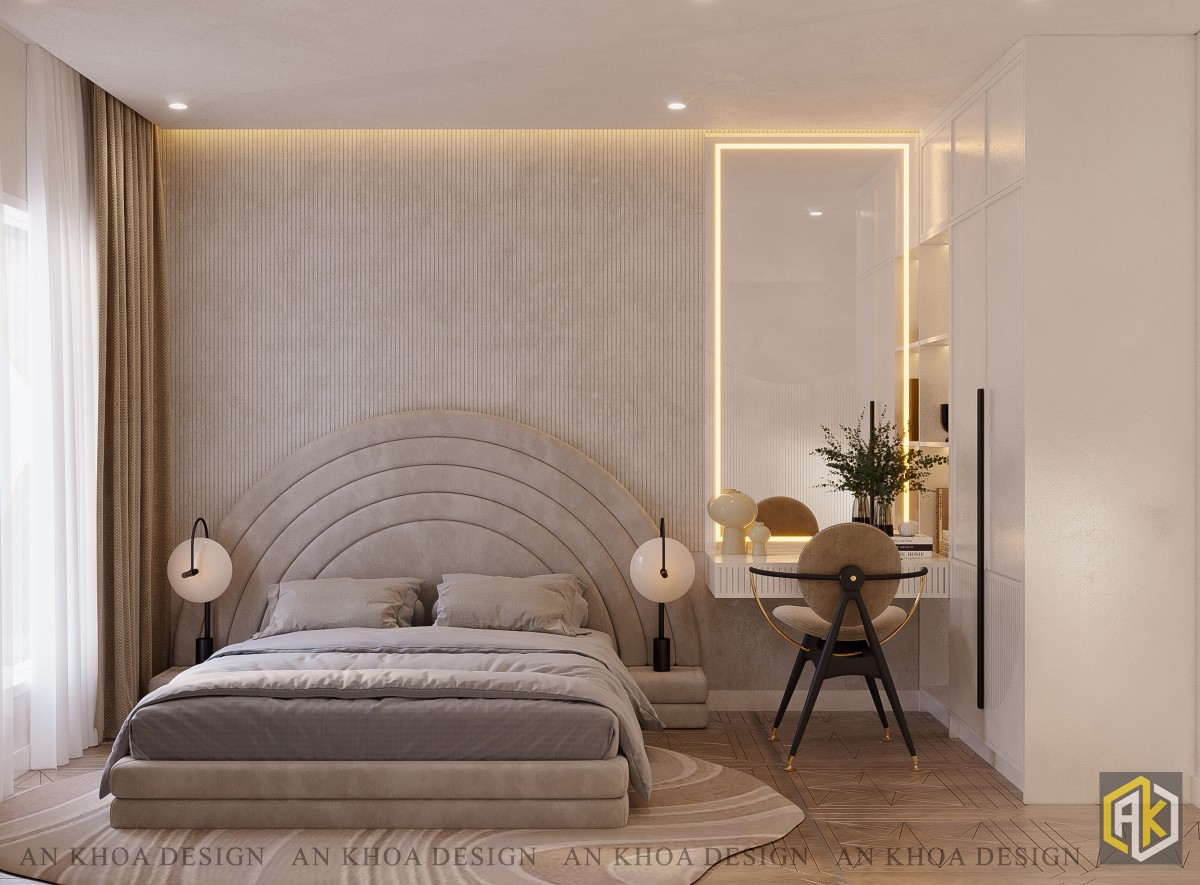Không gian phòng ngủ dịu dàng và ấm áp, với chiếc giường êm ái tựa vào vách tường bọc nệm mềm mại, khung cửa sổ duyên dáng và góc trang điểm thanh lịch