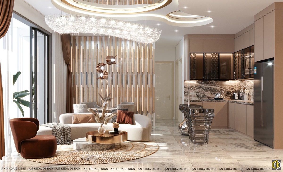 Không gian sống sang trọng với vách gỗ thanh lịch phân chia phòng khách và bếp, đèn chùm pha lê rực rỡ, sofa mềm mại và ấm áp, tạo nên tổng thể hài hòa, đẳng cấp