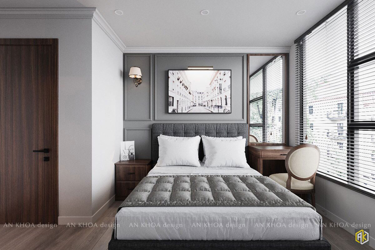 Phòng ngủ thanh lịch với tông trầm ấm, giường nỉ êm ái và ánh sáng tự nhiên chan hòa, tạo cảm giác yên bình và thư giãn