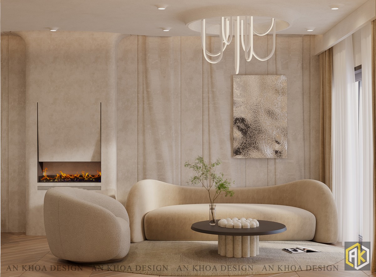 Không gian phòng khách mang đậm dấu ấn tự nhiên, với những đường cong mềm mại, chất liệu gỗ mộc mạc và ánh sáng dịu dàng, tạo nên một ốc đảo thư thái giữa nhịp sống hiện đại