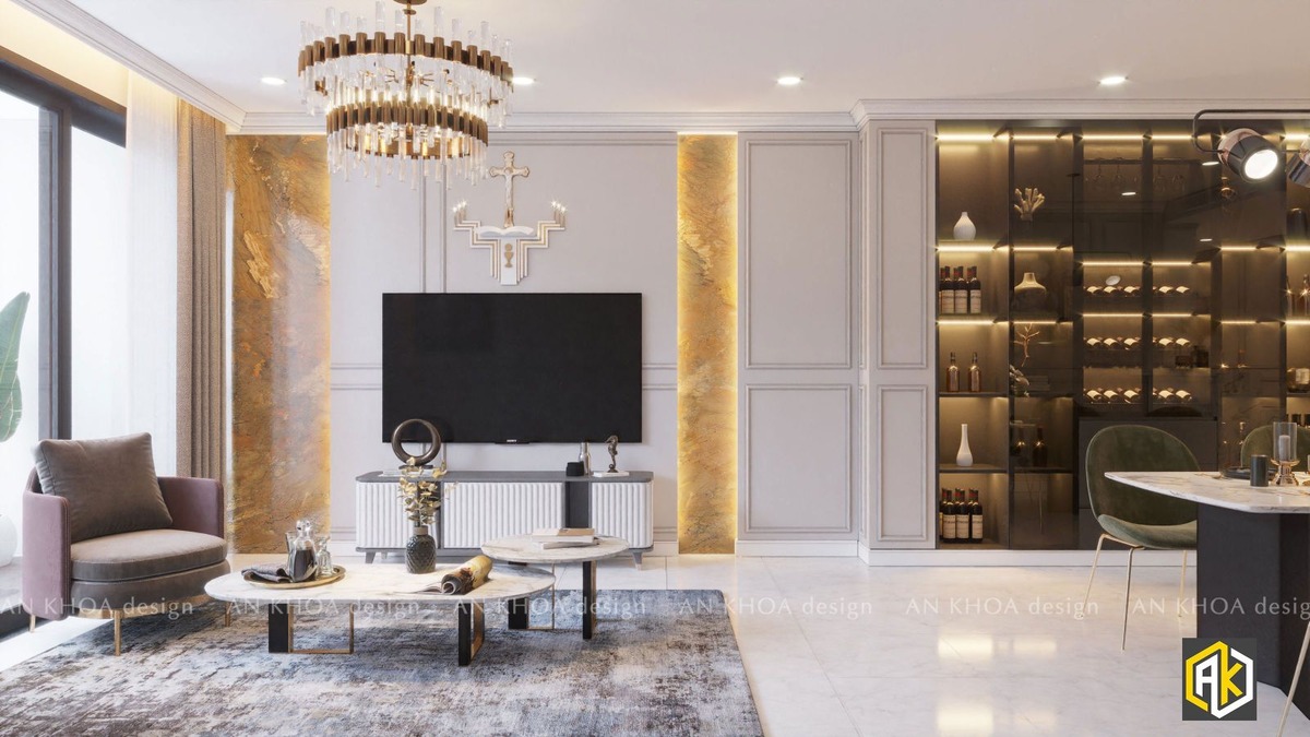 Phòng khách sang trọng và ấm cúng với điểm nhấn đèn chùm pha lê rực rỡ và kệ rượu lung linh ánh sáng – tạo nên không gian tiếp khách đẳng cấp, thư giãn đầy phong cách