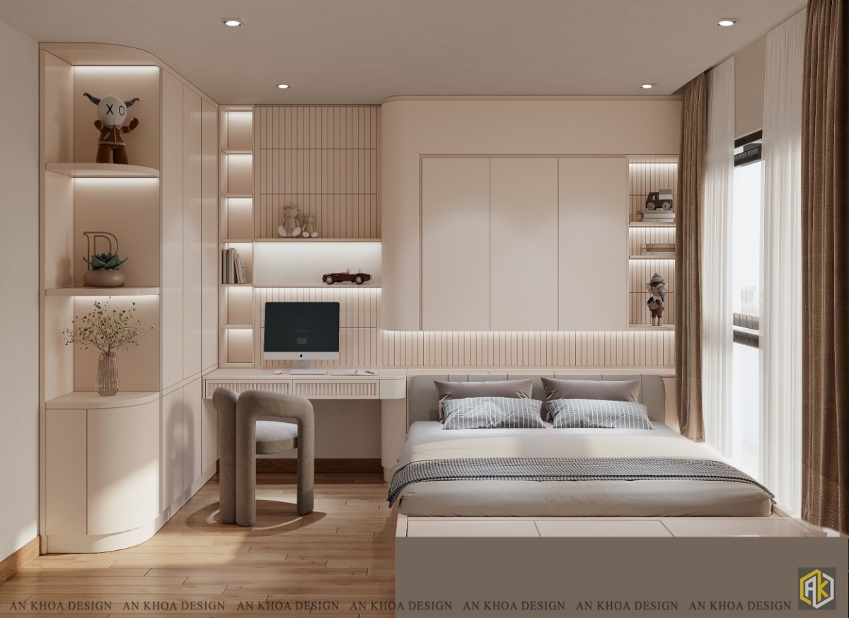 Phòng ngủ đa năng, nơi góc học tập và nghỉ ngơi được thiết kế liền mạch với những đường cong mềm mại và ánh sáng ấm áp, tạo cảm giác thư thái và khơi nguồn sáng tạo