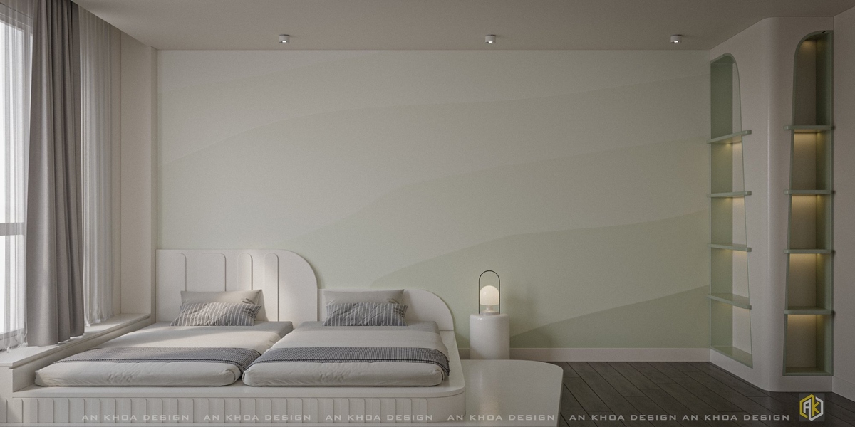Phòng ngủ thanh lịch với hai chiếc giường đơn tựa vào vách tường mềm mại, đón ánh sáng tự nhiên dịu dàng từ khung cửa sổ lớn, tạo cảm giác yên bình và thư thái